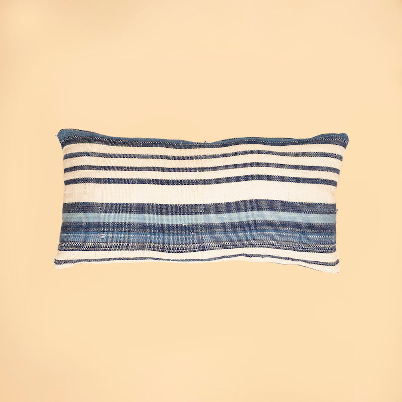 Complete your home decor with our throw pillow, featuring captivating indigo stripes handwoven from locally sourced 100% cotton yarns in Maitsidau village. The yarns were carefully dyed by master artisans at Kofar Mata in Kano state, Nigeria.