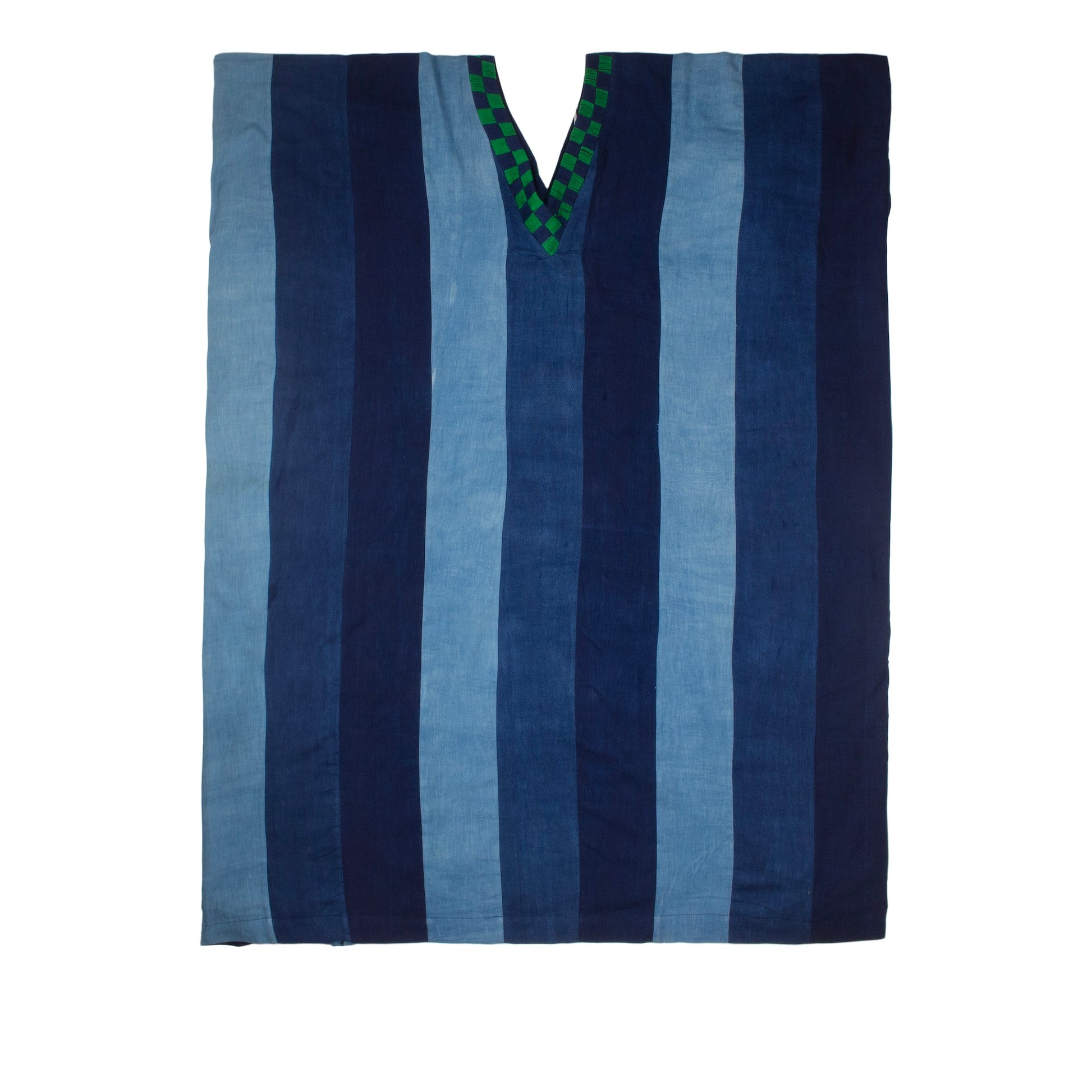 The Patchwork Babban Riga is a display of craftsmanship featuring different weaves of cotton in varying shades of blue.