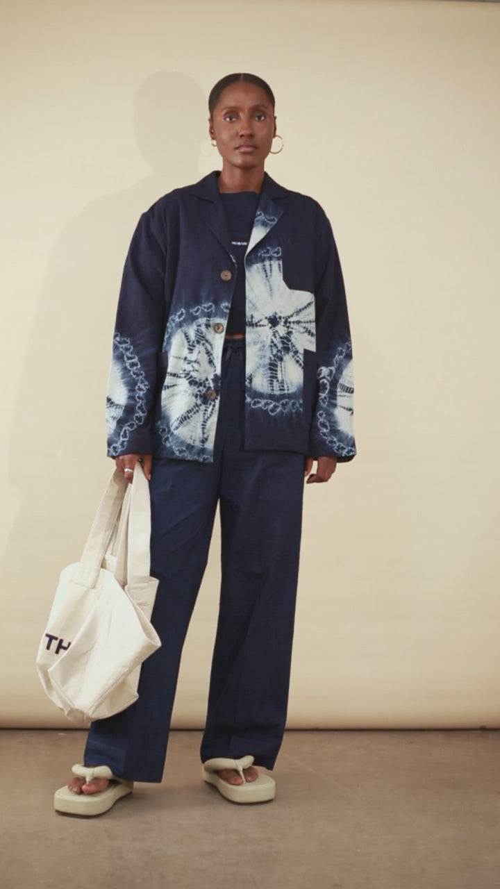 A half lined jacket featuring coconut shell buttons and 5 pockets (including an internal pocket), this uniform wear staple has a relaxed fit and light construction making it the perfect jacket for the warm tropics . Hand dyed in the centuries old kofar mata dye pits in Kano, Nigeria.